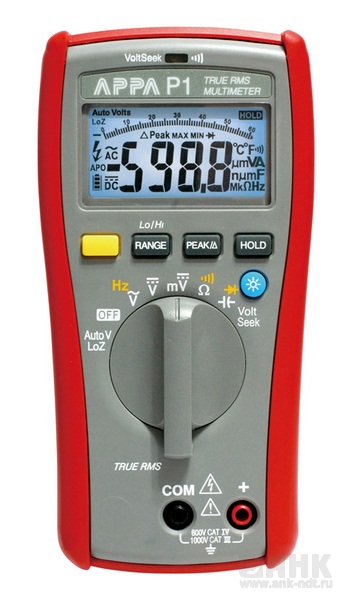 - Измерение переменного (АСV) и постоянного напряжения (DCV) до 600В, частоты, емкости, сопротивления до 40 МОм, испытание p-n переходов, проверка целостности цепи (прозвонка со звуковой и световой сигнализацией);