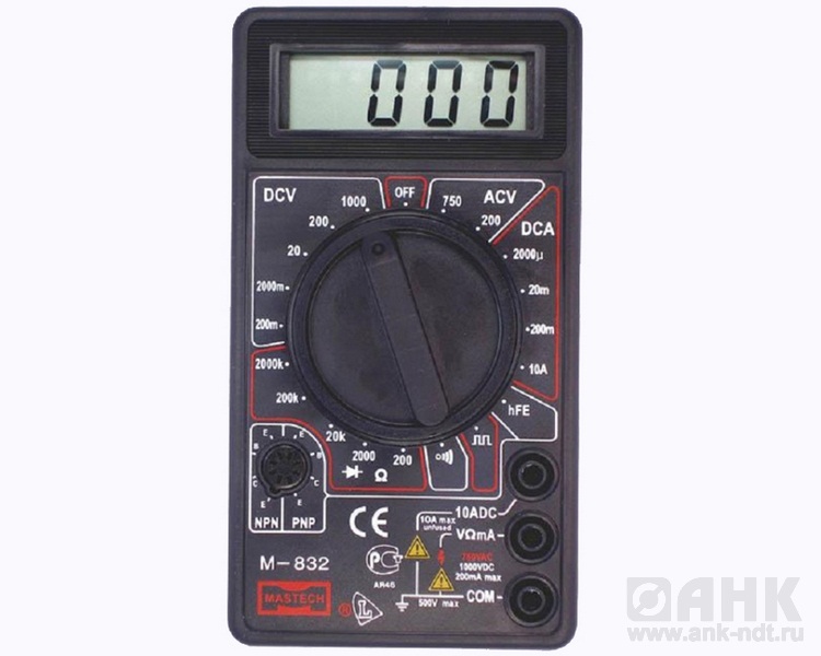 Цифровой мультиметр M832 производит измерения силы постоянного и переменного тока, величины постоянного и переменного напряжения, сопротивления и коэффициент усиления биполярных транзисторов (h21).