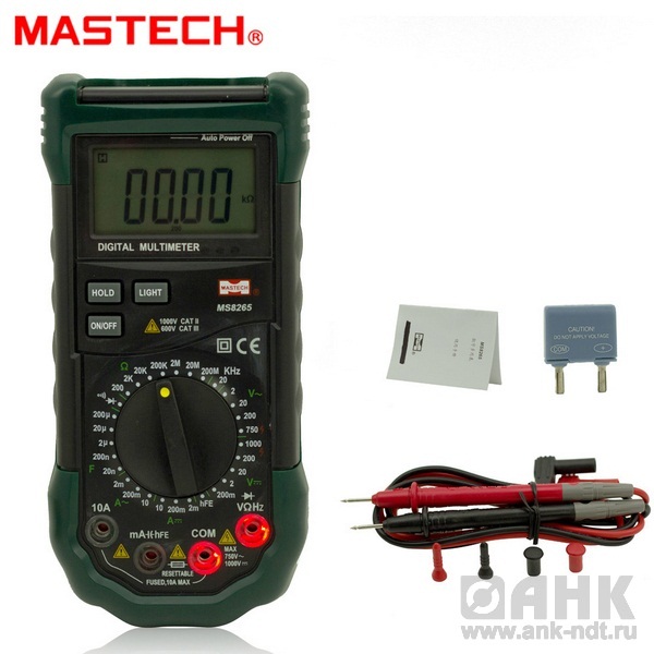 Цифровой мультиметр MS8265 позволяет измерять силу тока постоянного и переменного напряжения, величины постоянного и переменного напряжения, сопротивления, ёмкость конденсаторов, частоту сигнала и коэффициент усиления биполярных транзисторов.