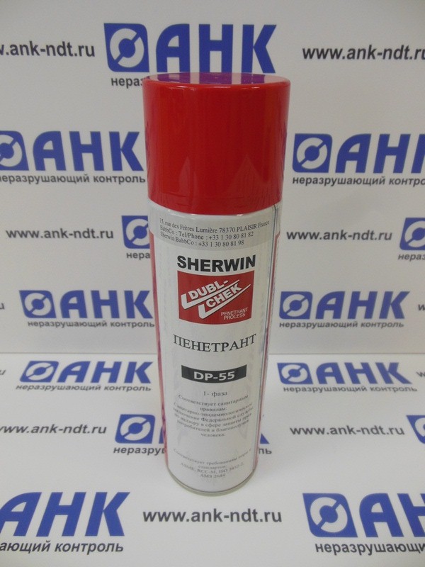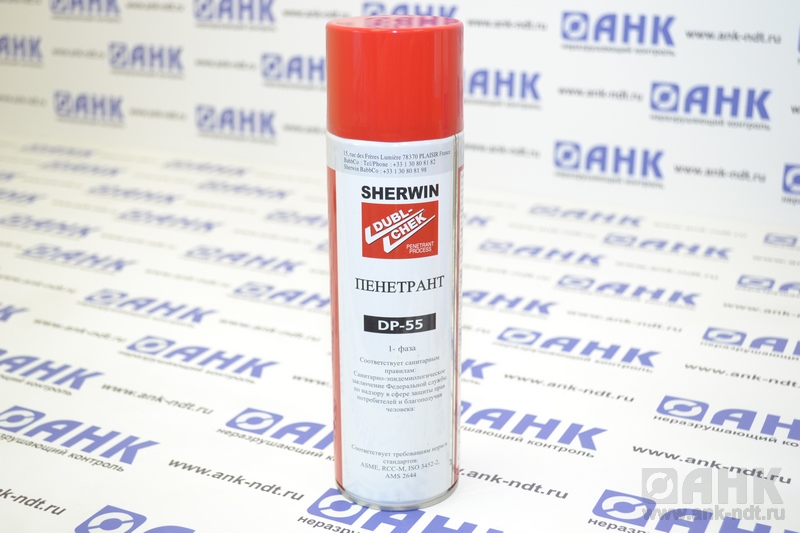 Компонент для проведения цветной капиллярной дефектоскопии SHERWIN DP-55, представляет собой проникающий пенетрант на основе насыщенного тёмно-красного красителя. Предназначен для выявления полостных дефектов, выходящих на поверхность материала. Совместим с рядом синтетических материалов и любыми металлами. При нанесении состав DP-55 равномерно распределяется по поверхности изделия. Может наноситься на поверхность, находящуюся под наклоном. Легко удаляется водой или растворителем. После проявления образует чёткий индикаторный рисунок на месте дефекта. Рекомендуется к применению в наборе с очистителем DR 60 (метод C), водой (метод A) и проявителем D 100. Производителем так же подтверждена совместимость пенетранта SHERWIN DP-55 со следующими материалами: очистители N 120, N 106A, DR 62; безводные проявители R 60, R 62.