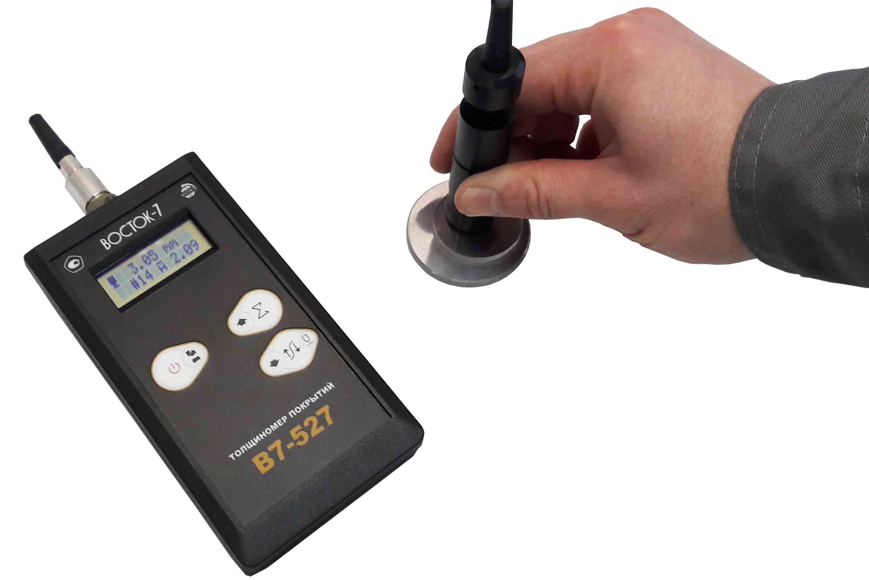 Толщиномеры покрытий В7-527 с выносным (съёмным) датчиком применяются для измерений толщины немагнитных диэлектрических покрытий (напр. лаки, краски и др. диэлектрики) или немагнитных проводящих (гальванических как цинк, хром, серебро, кадмий, алюминий, медь и др.) покрытий, нанесённых на ферромагнитное основание.