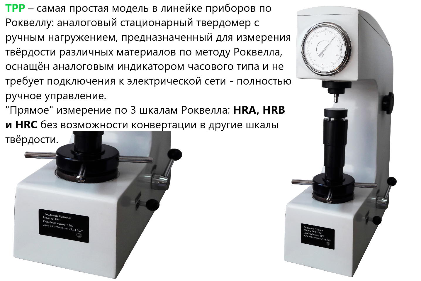 ТРР – самая простая модель в линейке приборов по Роквеллу: аналоговый стационарный твердомер с ручным нагружением, предназначенный для измерения твёрдости различных материалов по методу Роквелла, оснащён аналоговым индикатором часового типа и не требует подключения к электрической сети - полностью ручное управление (условная расшифровка Твердомер Роквелла Ручной).