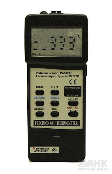 Профессиональный прецизионный цифровой измеритель температуры с возможностью передачи данных на компьютер. Имеет высокую точность измерений, возможность работы с термопарами 5-ти типов и термосопротивлением АТА-2210, современный дизайн, прочный и удобный портативный корпус. Выбор типа датчика осуществляется нажатием кнопки на лицевой панели. Использование 4-проводной схемы позволяет по мере необходимости удлинять кабель, связывающий терморезистор АТА-2210 c измерительным устройством. Прибор снабжен рядом дополнительных функций, среди которых удержание показаний, отображение максимальных и минимальных значений в ходе измерения, режим относительных измерений, индикация разряда батареи.