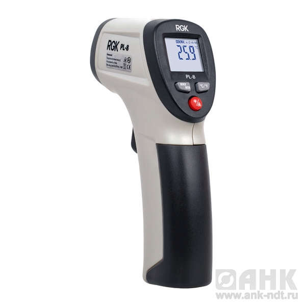 Пирометр RGK PL-8 – это универсальный инфракрасный термометр, позволяющий быстро и безопасно определить температуру любой поверхности. При небольшом весе и компактных габаритах этот инфракрасный пирометр оснащён всем необходимым набором функций и представляет собой самый доступный прибор этого типа на российском рынке. Благодаря своим характеристикам RGK PL-8 идеально подходит для регулярного контроля на производстве, в сфере ЖКХ и в быту, так как невысокая цена и интуитивная простота обращения делает этот пирометр доступным широкому кругу пользователей. Прибор выполнен в виде пистолетной рукояти с большой спусковой кнопкой, что обеспечивает удобство измерения, а инфракрасный метод измерения гарантирует безопасность пользователя даже при работе с сильно нагретой поверхностью или проводниками под током.