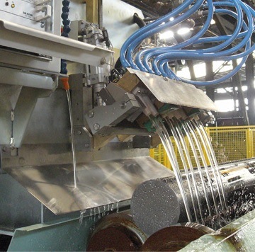 Ключевой пункт контроля заготовок труб – это контроль их соединений. Ультразвуковой контроль с применением управляемых водяных форсунок практически не изнашивает держатель и позволяет быстро изменять диаметр оцениваемых заготовок. Эта технология так же называется омывающей и использует водяную прослойку между датчиком и заготовкой. Расстояние между датчиком и поверхностью трубы составляет несколько сантиметров, благодаря чему датчик практически не изнашивается. Вместо двухэлементных датчиков (использовавшихся в старых системах) используются датчики иммерсионного типа с широким диапазоном. Поскольку здесь башмаки не нужно менять в соответствии с диаметром трубы, то подстройка к диаметру проводится очень быстро.