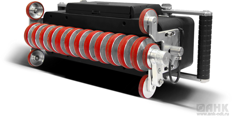 • АР моноблока смонтирована в нижней части прямоугольного корпуса, который снабжён ручками для его удержания. Ручки имеют несколько фиксированных положений, поэтому их можно установить под разными углами к лицевой панели. Все элементы АР имеют независимый подпружиненный подвес и могут перемещаться вдоль своих продольных осей. Это позволит вести контроль не только плоских участков ОК, но и выпуклых с радиусом кривизны от 1400 мм и более, а также и вогнутых с таким же минимальным радиусом.