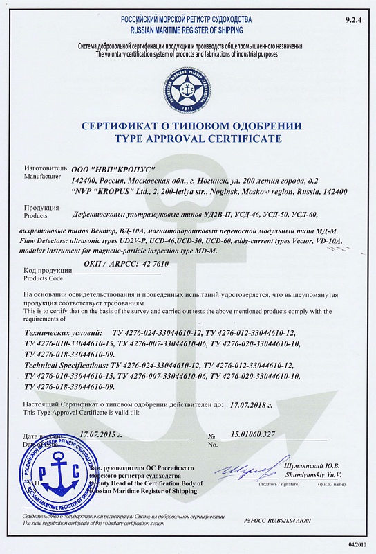 Сертификат Госстандарта России RU.C.27.003.A №59426, зарегистрирован в Государственном реестре средств измерений под №34808-15 и допущен к применению в Российской Федерации.