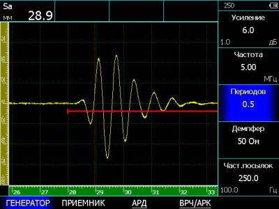 радиоимпульс, амплитудой 50 или 200 В, с изменяемой длительность от 16 до 500 нс, с шагом 16 нс