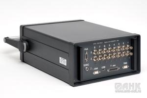 • Порты: 2 x Lemo 1 (для датчиков), связь с ПК: USB, порт D-sub (9 контактов) триггер (вход), порт D-sub (9 контактов) аналоговый вывод значений дефекта, порт D-sub (25 контактов) TTL вывод значений дефекта, выход VGA (15 контактов), 16 коннекторов BNC для подключения тонкого коаксиального кабеля (для датчиков), разъём питания 12 В (3 контакта)