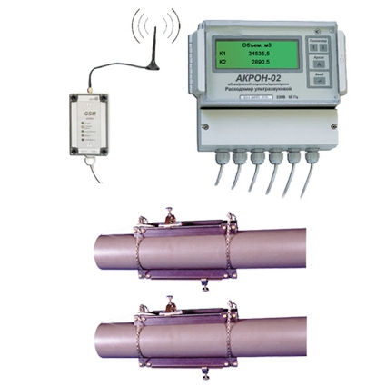 Расходомер АКРОН-02 включает в себя первичный преобразователь ПП-1 и электронный блок БЭ-1, соединенные радиочастотным кабелем. ПП-1 состоит из двух ультразвуковых излучателей и устройства для их крепления на трубе. ПП-1 устанавливается на прямолинейном участке трубопровода на наружной поверхности, очищенной от грязи, краски и ржавчины.